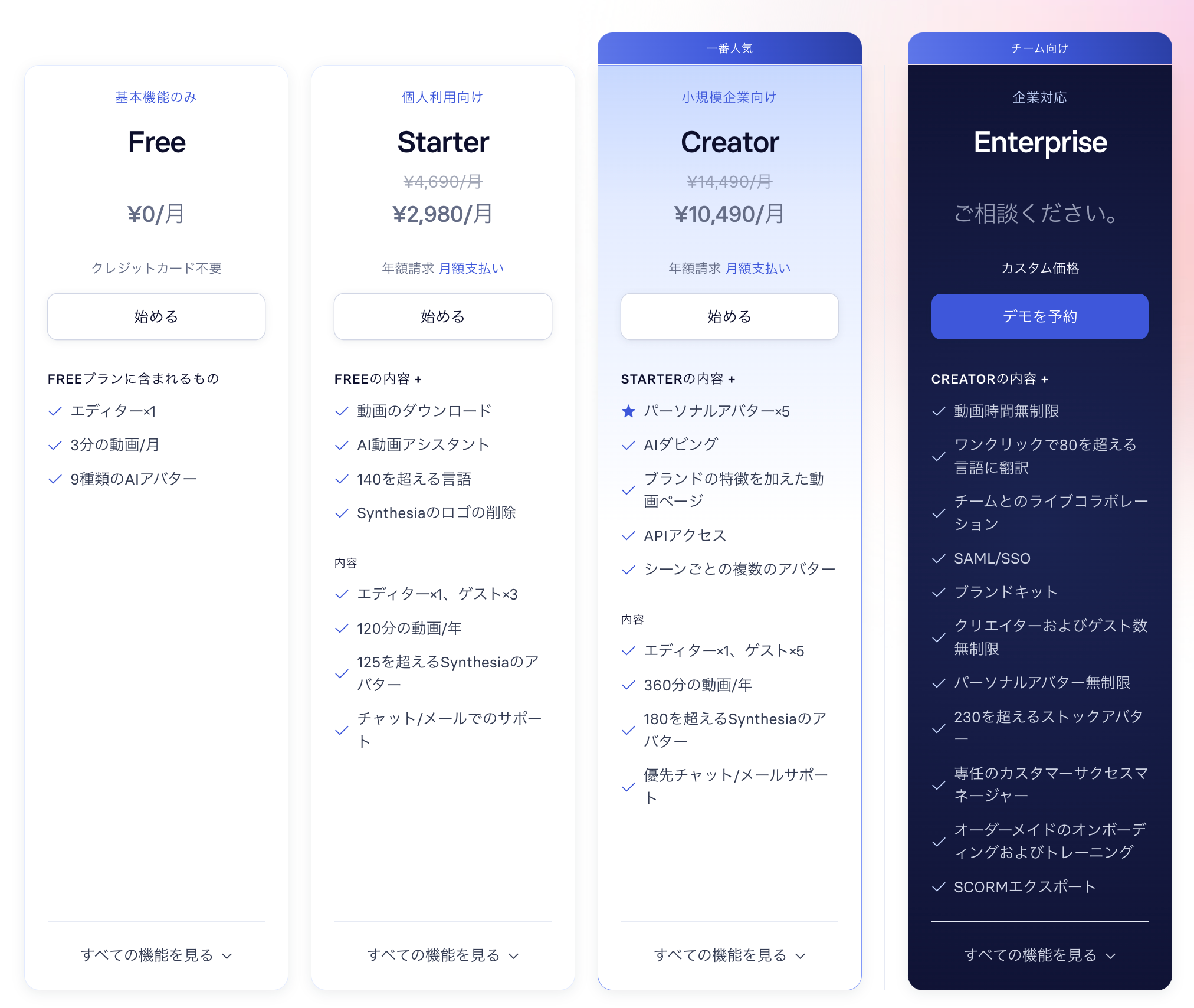 | Creator | カスタム価格 | 動画時間無制限、パーソナルアバター無制限、チームでのライブコラボレーション対応 | 大規模企業やグローバルな展開が必要なチーム |