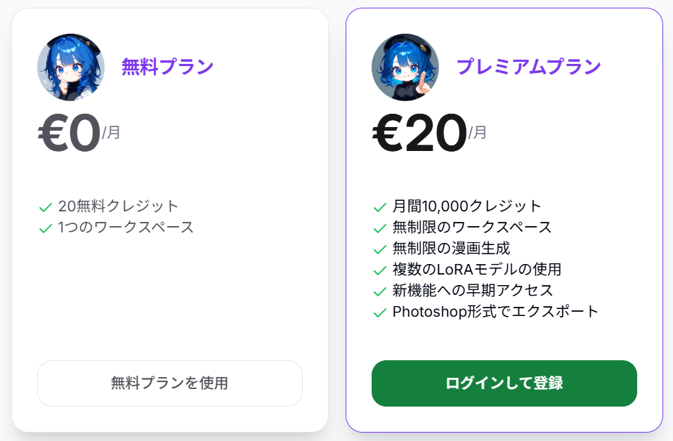 プレミアムプラン | €20/月 | 10,000クレジット/月、無制限生成、LoRAモデル利用、商用利用可 |