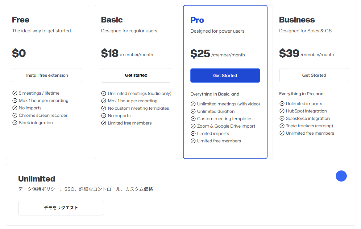 | Pro | $25 | 動画対応・無制限録音/録音時間無制限/カスタムテンプレート/Zoom・Google Driveインポート/無料メンバー制限あり |