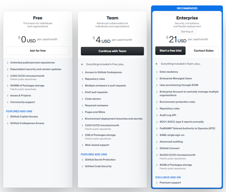 | Free | $0 | 個人および小規模チーム向けの基本機能。パブリック/プライベートリポジトリ、CI/CDなどが利用可能。 |