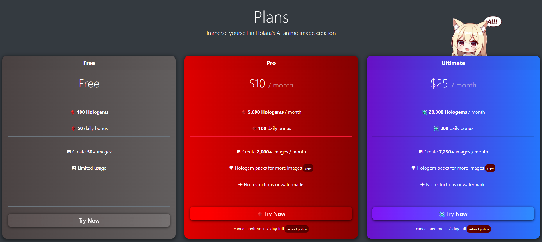 | Free | 無料 | ・初期付与 100 Hologems ・毎日ログインボーナス 50 Hologems ・50枚以上の画像生成が可能 ・利用制限あり |