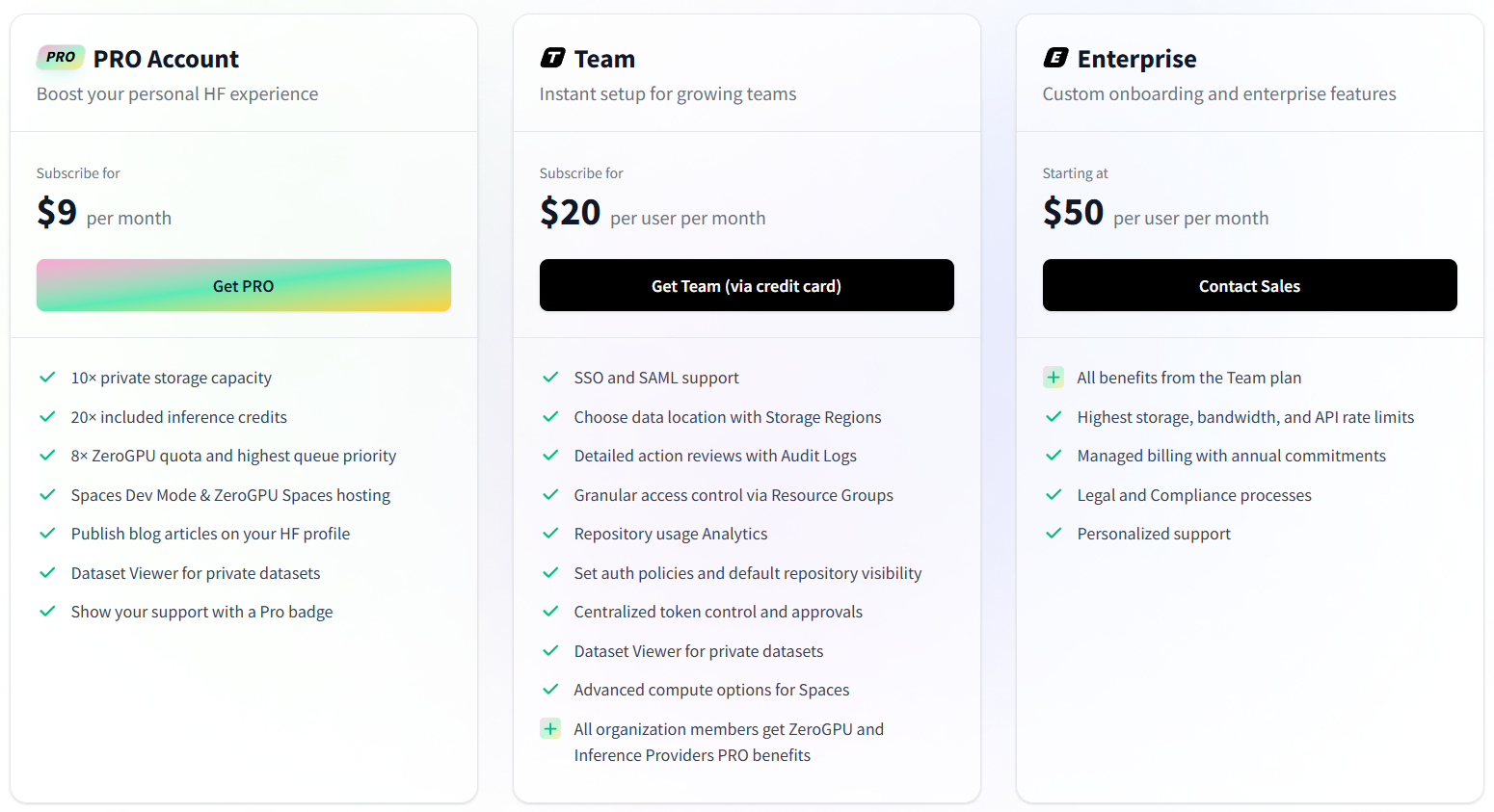 | Pro | $9 / 月 | 10倍のプライベートストレージ、20倍の推論クレジット、ZeroGPU 優先、ブログ投稿、Pro バッジ付与 |