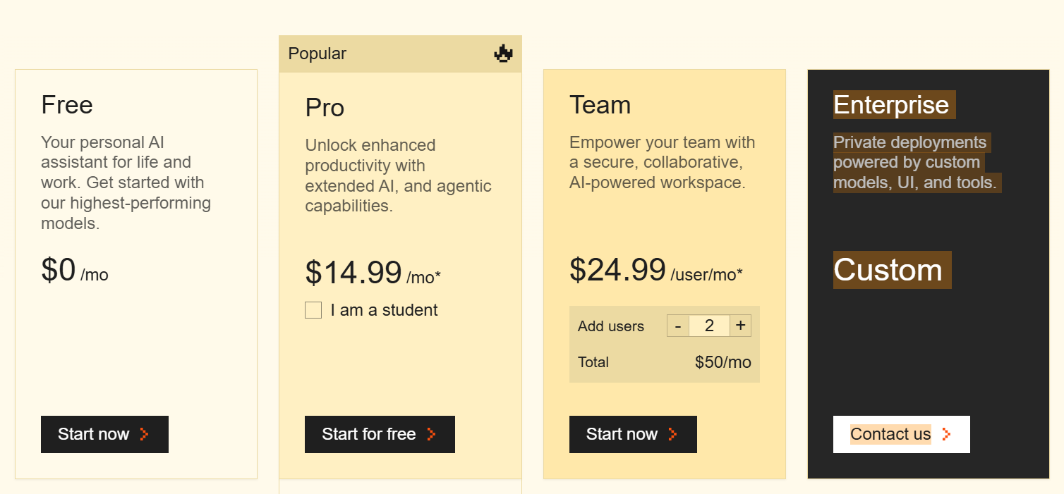 | Free | $0 | 個人利用向け。高性能モデルを制限付きで使用可能。Web検索、文書アップロード、画像生成等の基本機能を搭載。 |