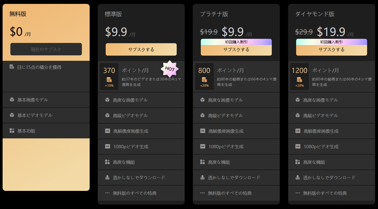 | プラチナ版 | $19.9 (初回$9.9) | 月800ポイント (+20%) | スタンダードの機能すべて + より多くの生成枠 |
