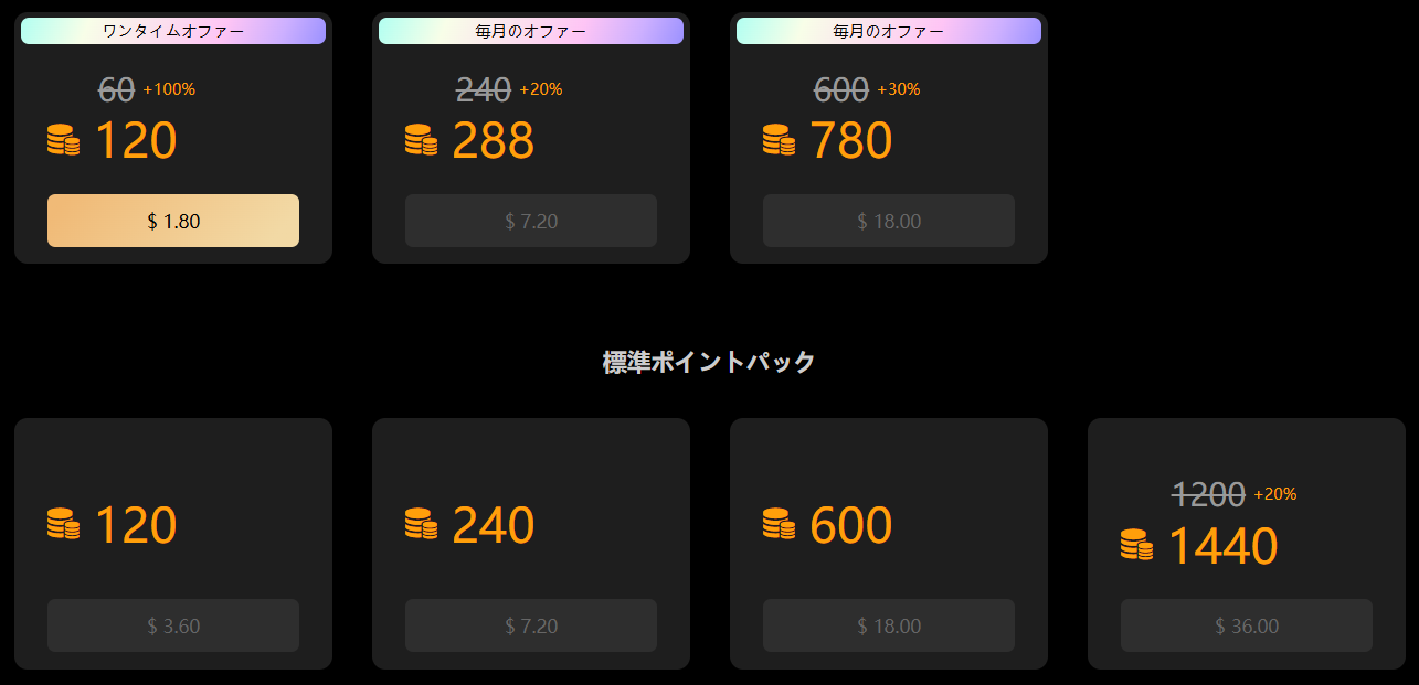 | 標準パック(1,200+20%) | 1,440 | $36.00 |