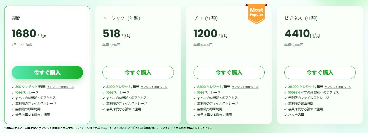 | プロ(週間) | ¥1,680/週 | 毎週300クレジット・10GBストレージ・全AI機能利用可・無制限録画・マルチデバイス対応・データ保留永久 |