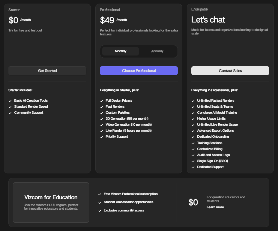 | Professional | $49/月 | Full Design Privacy、Fast Render、Custom Palettes、3D生成50件/月、動画生成10件/月、Live Render 5時間/月、Priority Support |