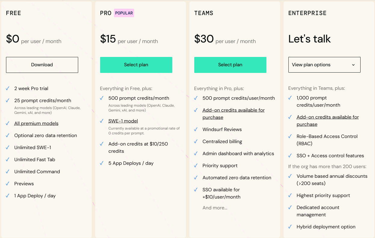 Free | $0 | - 2週間のProトライアル付き - 月25クレジット(主要AIモデル利用) - SWE-1/Fast Tab/Command機能:無制限 - データ保持ゼロ設定:オプション - アプリデプロイ:1回/日 |