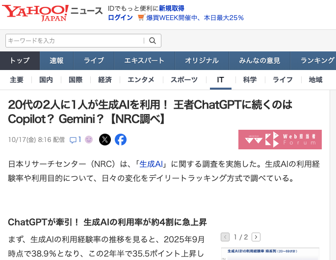 衝撃的なデータが飛び込んできました。 日本リサーチセンター(NRC)が2025年9月に実施した調査によると、20代の生成AI利用率が、ついに5割を超えたというのです(男性55%、女性51%)。