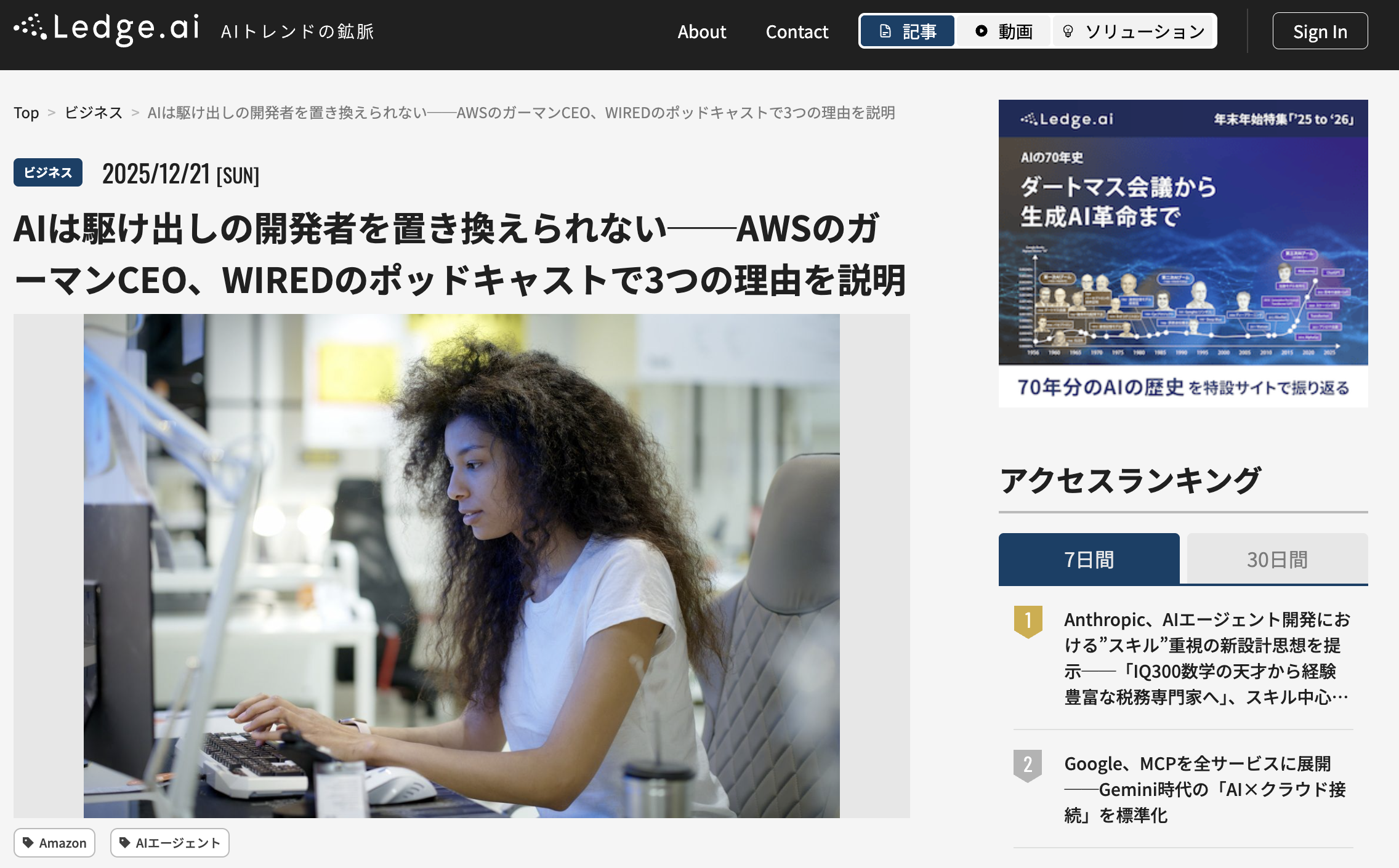 Ledge.ai「AIは駆け出しの開発者を置き換えられない──AWSのガーマンCEO、WIREDのポッドキャストで3つの理由を説明」