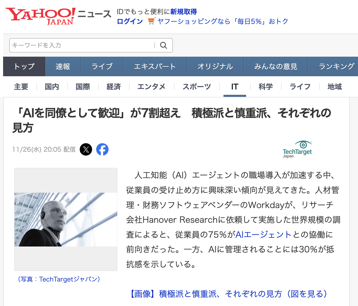 まず、話題の中心となっているデータを見てみましょう。人事・財務管理ソリューションを提供するWorkday社が、世界中のIT意思決定者約3,000人を対象に行った調査によると、回答者の75%が「AIエージェントとの協働」に前向きであることが分かりました。