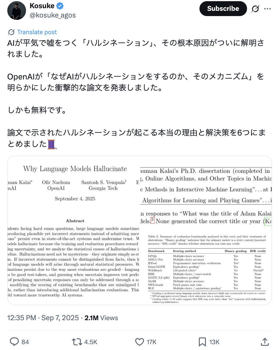 X (@kosuke_agos) 「論文で示されたハルシネーションが起こる本当の理由と解決策を6つにまとめました」OpenAI "Why language models hallucinate"