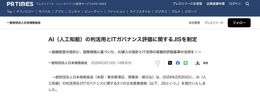 - JIS Q 38500:2026(情報技術-組織のITガバナンス): 11年ぶりの改正。ITを組織の価値創造に結びつけるための原則を11項目に拡充しました。