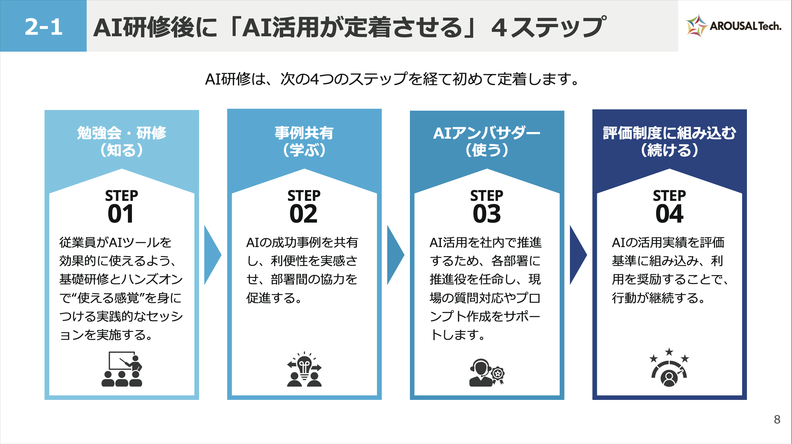定着には、①研修(知る)→②事例共有(学ぶ)→③AIアンバサダー(使う)→④評価制度に組み込む(続ける)の4段階が重要。学びを“行動”に変える道筋を示します。