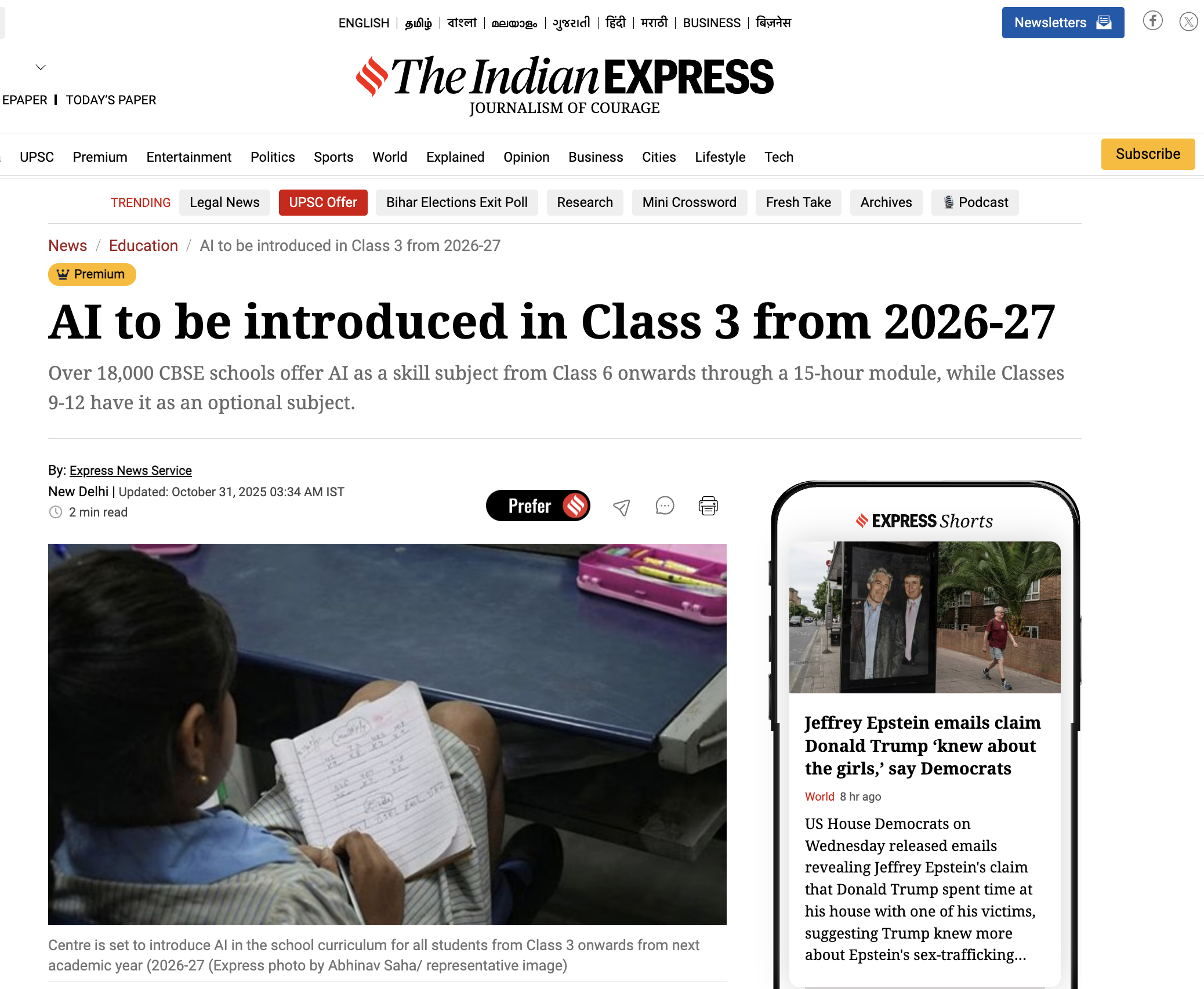 The Indian Express「AI to be introduced in Class 3 from 2026-27」