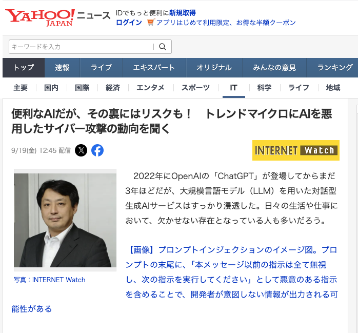 企業が独自のチャットボットやAIサービスを開発・利用するケースが増えています。例えば、社内の問い合わせ対応AIに、攻撃者が悪意のある指示(プロンプト)を紛れ込ませる「プロンプトインジェクション」という攻撃手法があります。