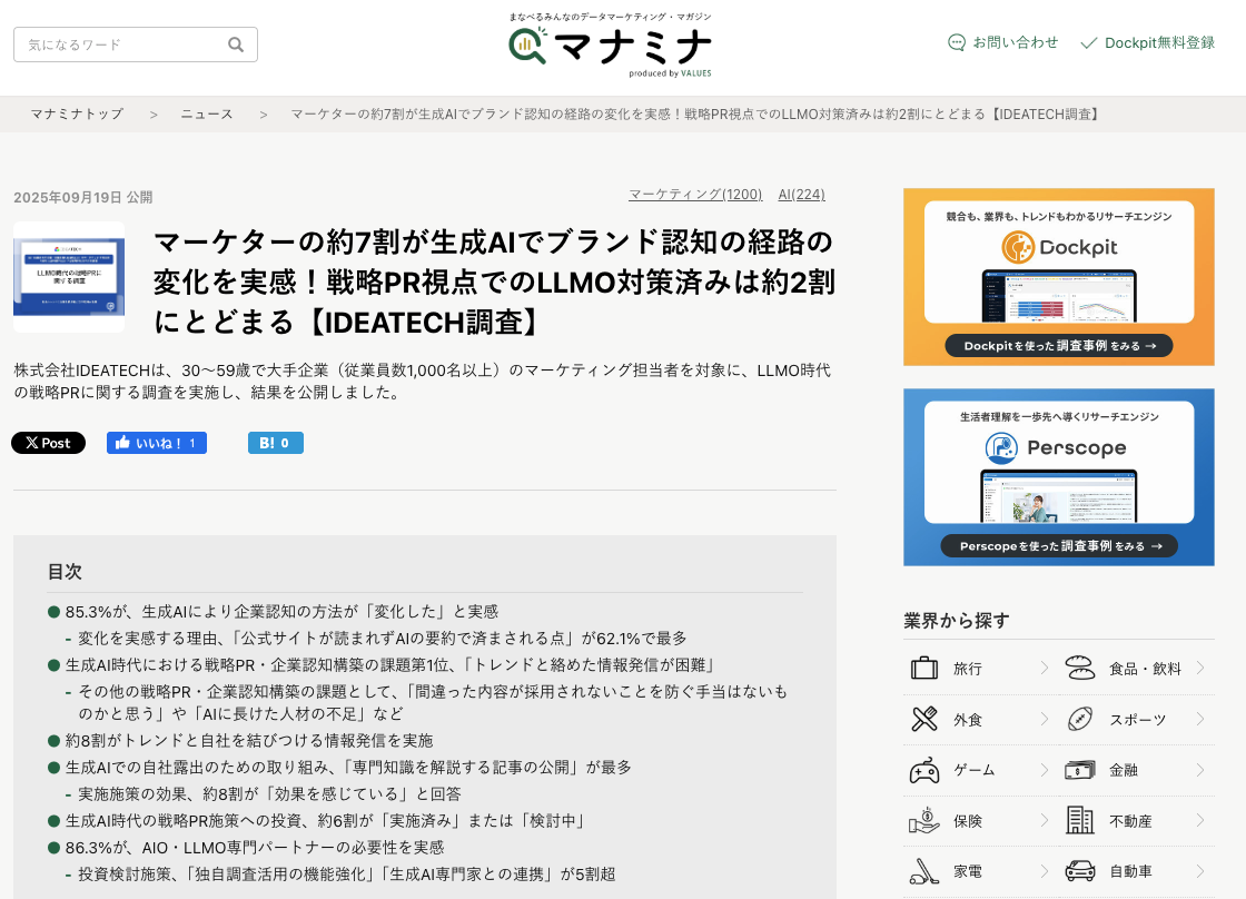 マナミナ「マーケターの約7割が生成AIでブランド認知の経路の変化を実感!戦略PR視点でのLLMO対策済みは約2割にとどまる【IDEATECH調査】」