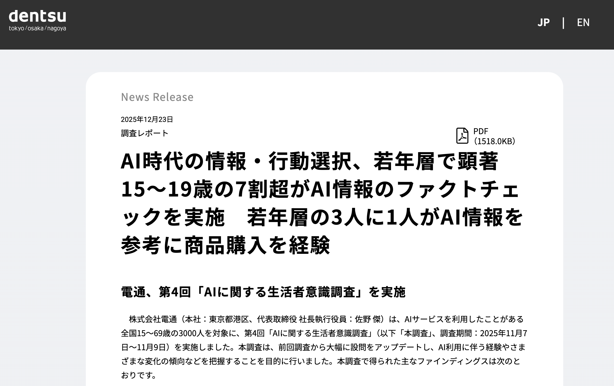 電通「AI時代の情報・行動選択、若年層で顕著 15~19歳の7割超がAI情報のファクトチェックを実施 若年層の3人に1人がAI情報を参考に商品購入を経験 」
