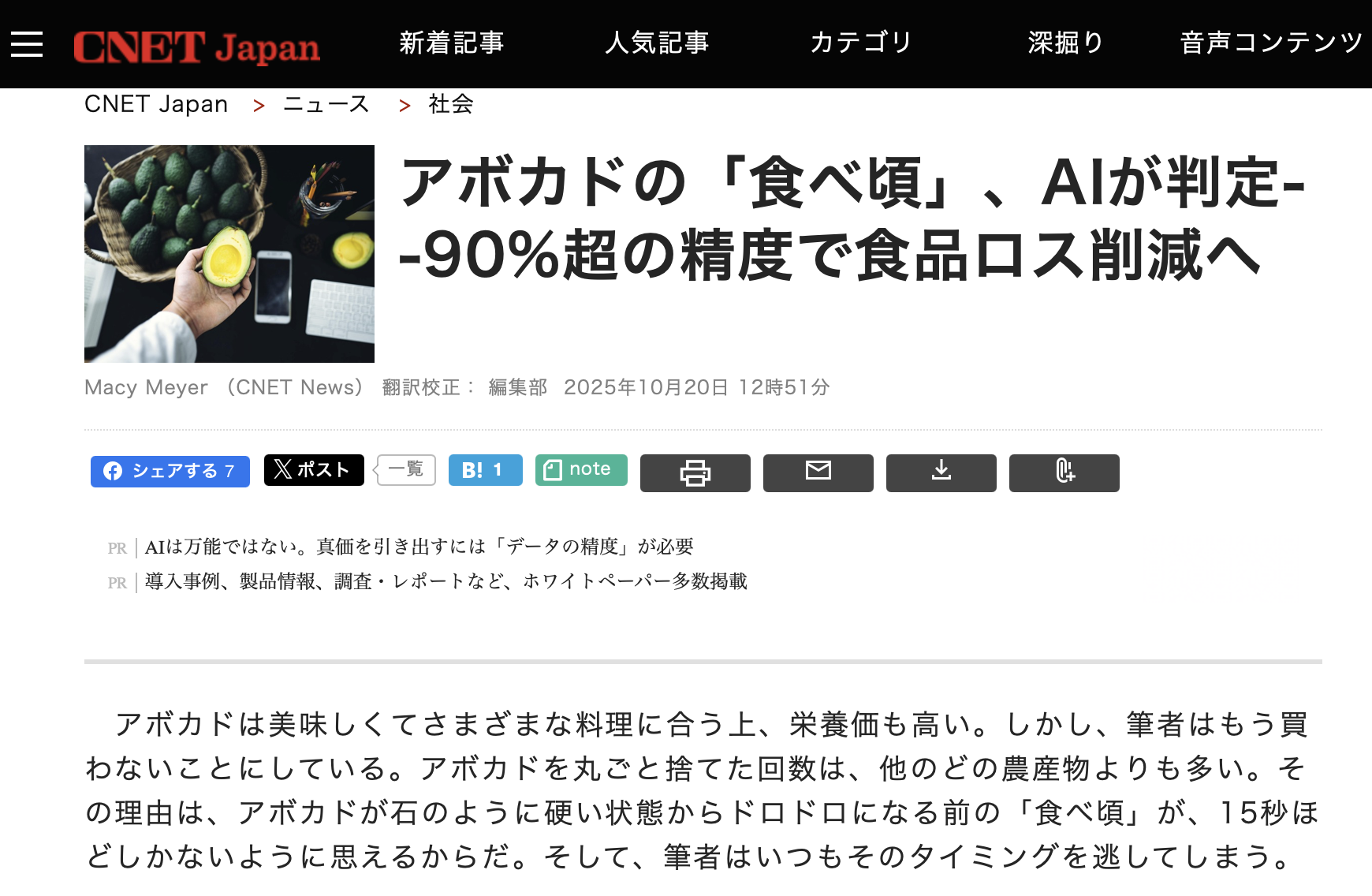 - AIがセンサーデータを学習し、アボカドの「食べ頃」を90%超の精度で非破壊判定。