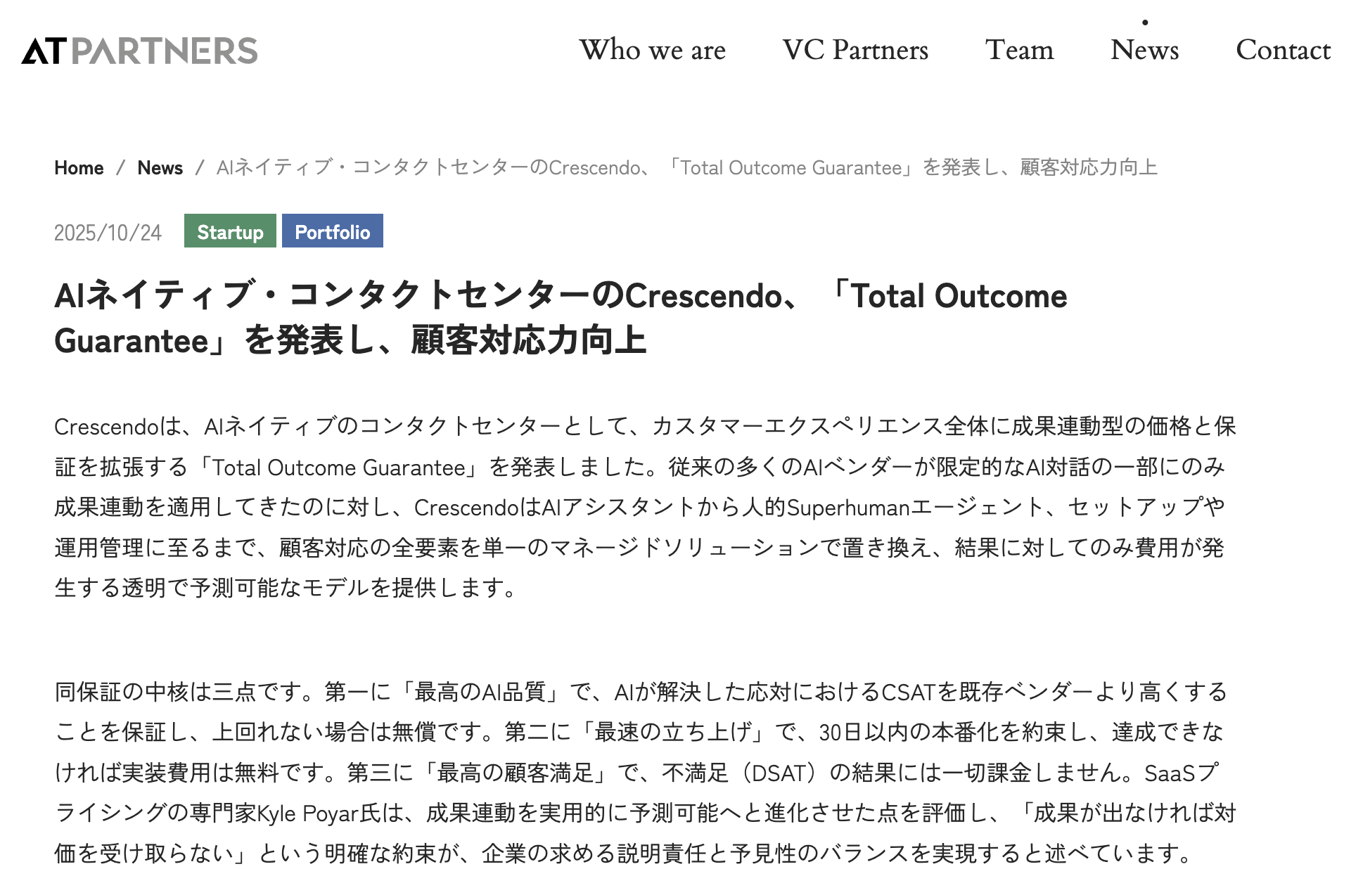 AT PARTNERS「AIネイティブ・コンタクトセンターのCrescendo、「Total Outcome Guarantee」を発表し、顧客対応力向上」