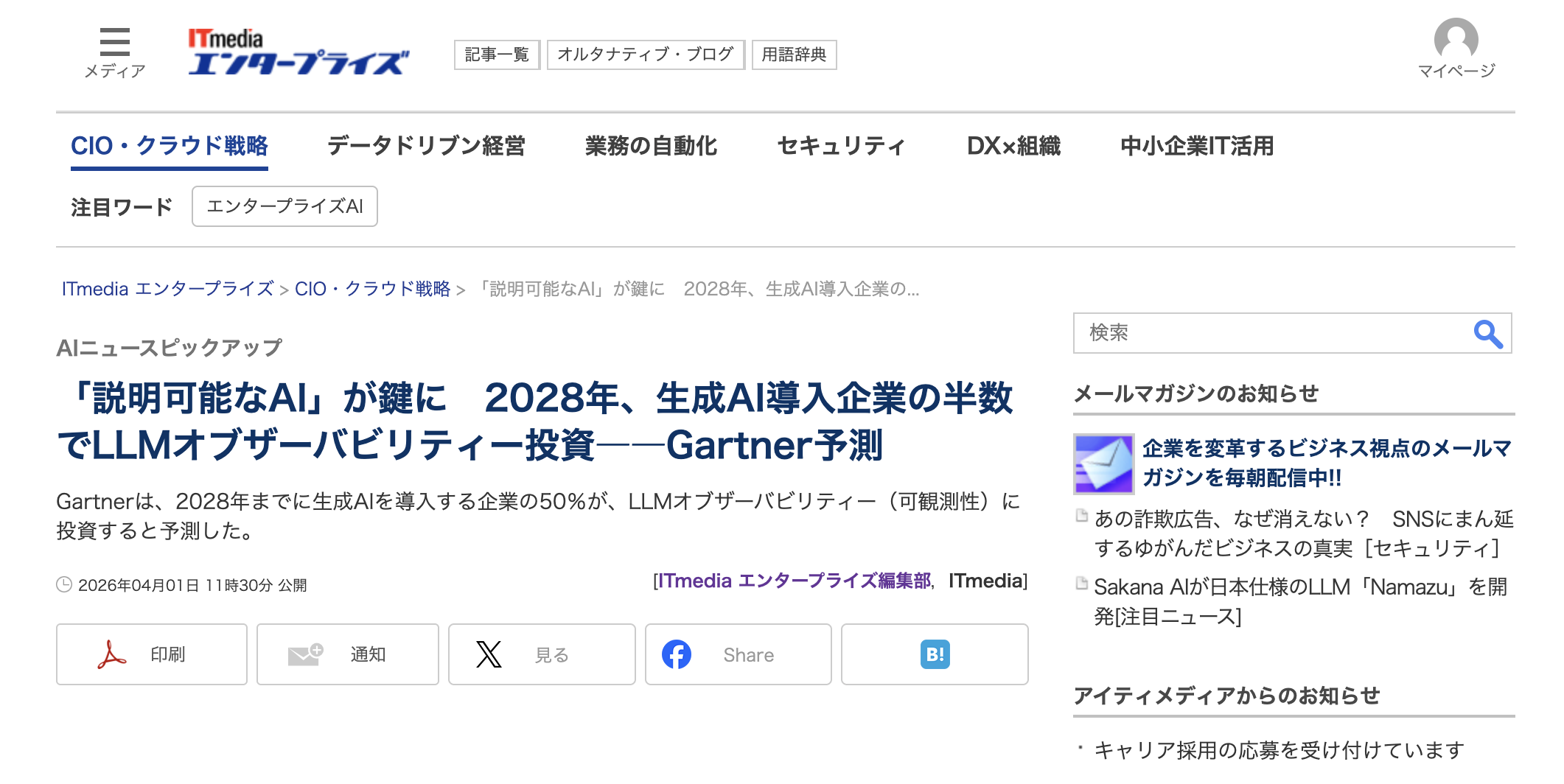 ITmediaエンタープライズ「「説明可能なAI」が鍵に 2028年、生成AI導入企業の半数でLLMオブザーバビリティー投資――Gartner予測」