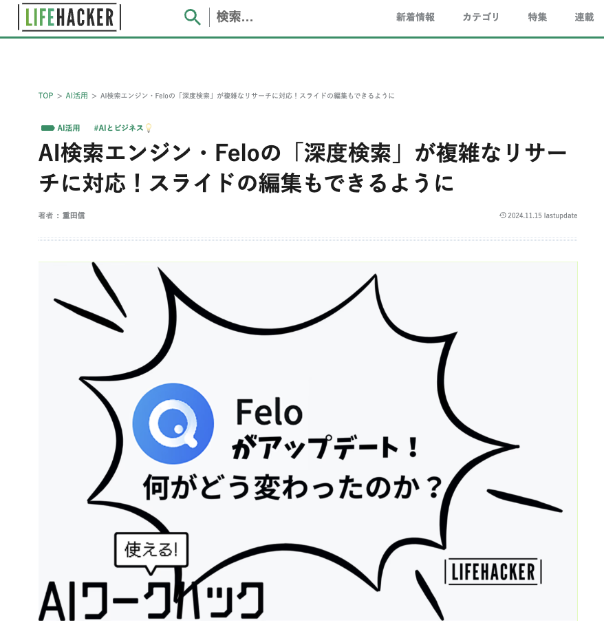 Feloの公式発表によると、この機能は独自の推論モデルを搭載しており、特に「5W2H」のフレームワークを用いて情報を構造化します。これにより、表面的な事実の羅列ではなく、背景や因果関係まで踏み込んだ、まるで人間が思考してまとめたような回答の生成を可能にしています。