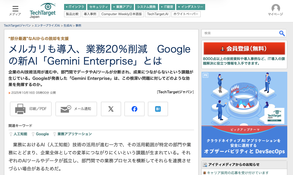TechTarget Japan「メルカリも導入、業務20%削減 Googleの新AI「Gemini Enterprise」とは 」