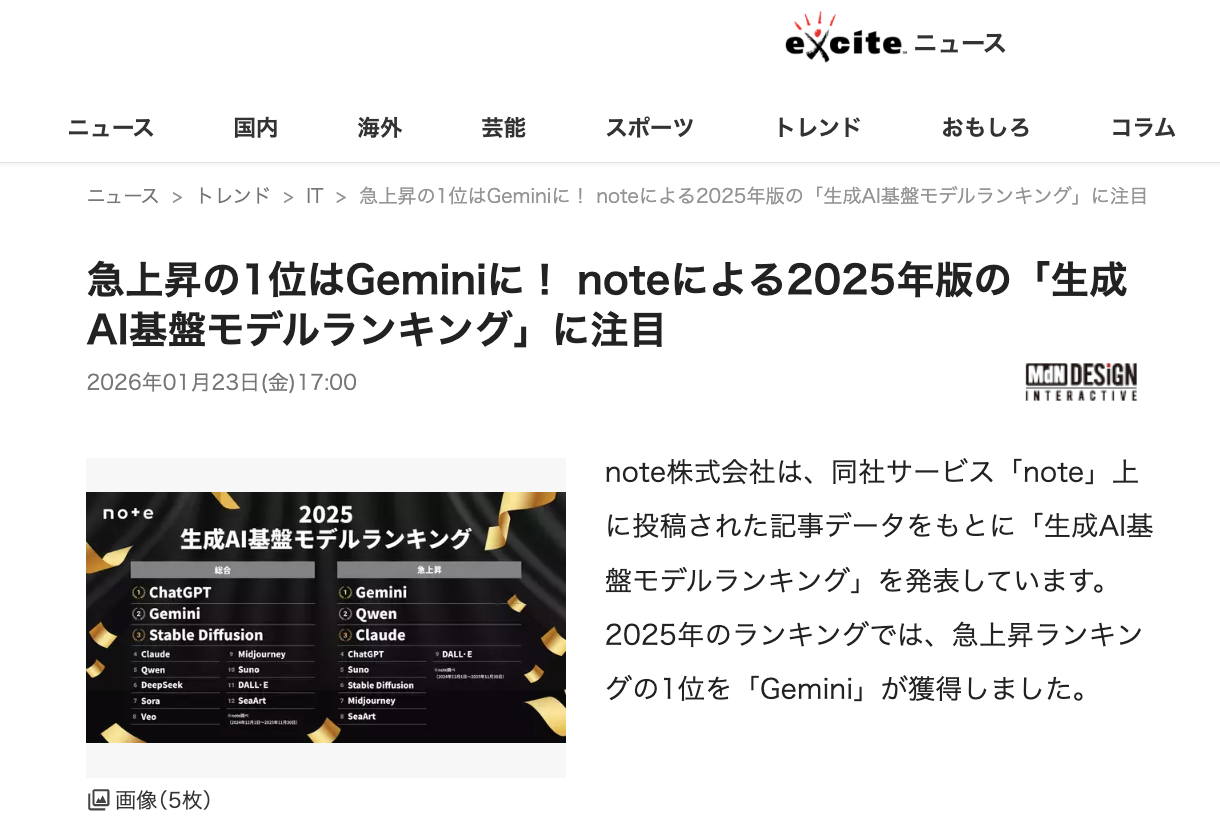exciteニュース「急上昇の1位はGeminiに! noteによる2025年版の「生成AI基盤モデルランキング」に注目」