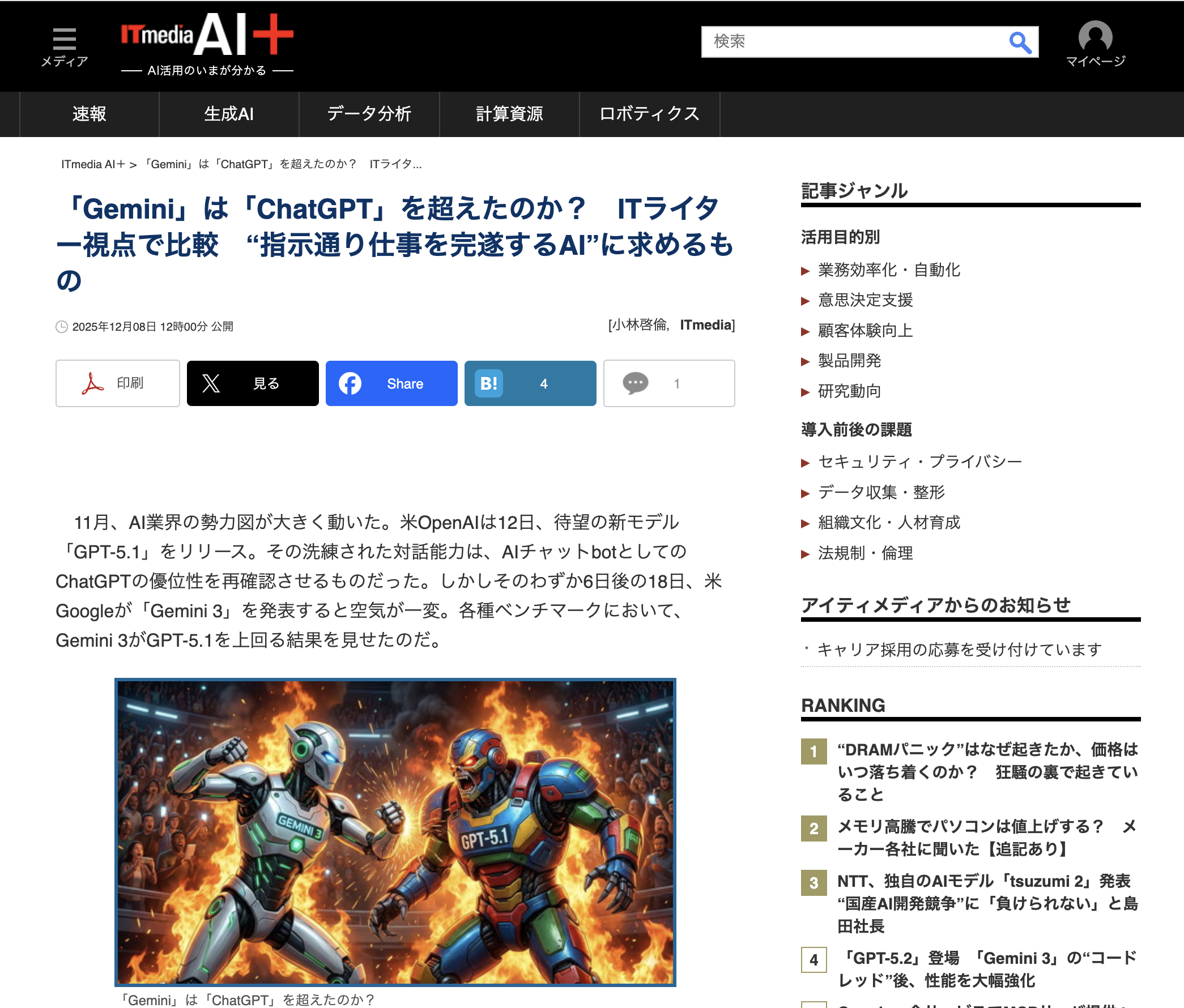 ITmedia AI+「「Gemini」は「ChatGPT」を超えたのか? ITライター視点で比較 “指示通り仕事を完遂するAI”に求めるもの」