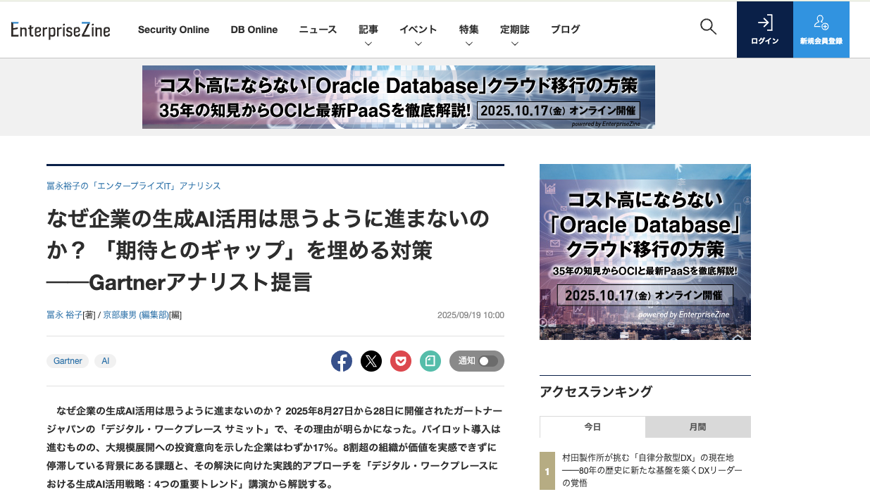 Enterpriseine「なぜ企業の生成AI活用は思うように進まないのか? 「期待とのギャップ」を埋める対策──Gartnerアナリスト提言」