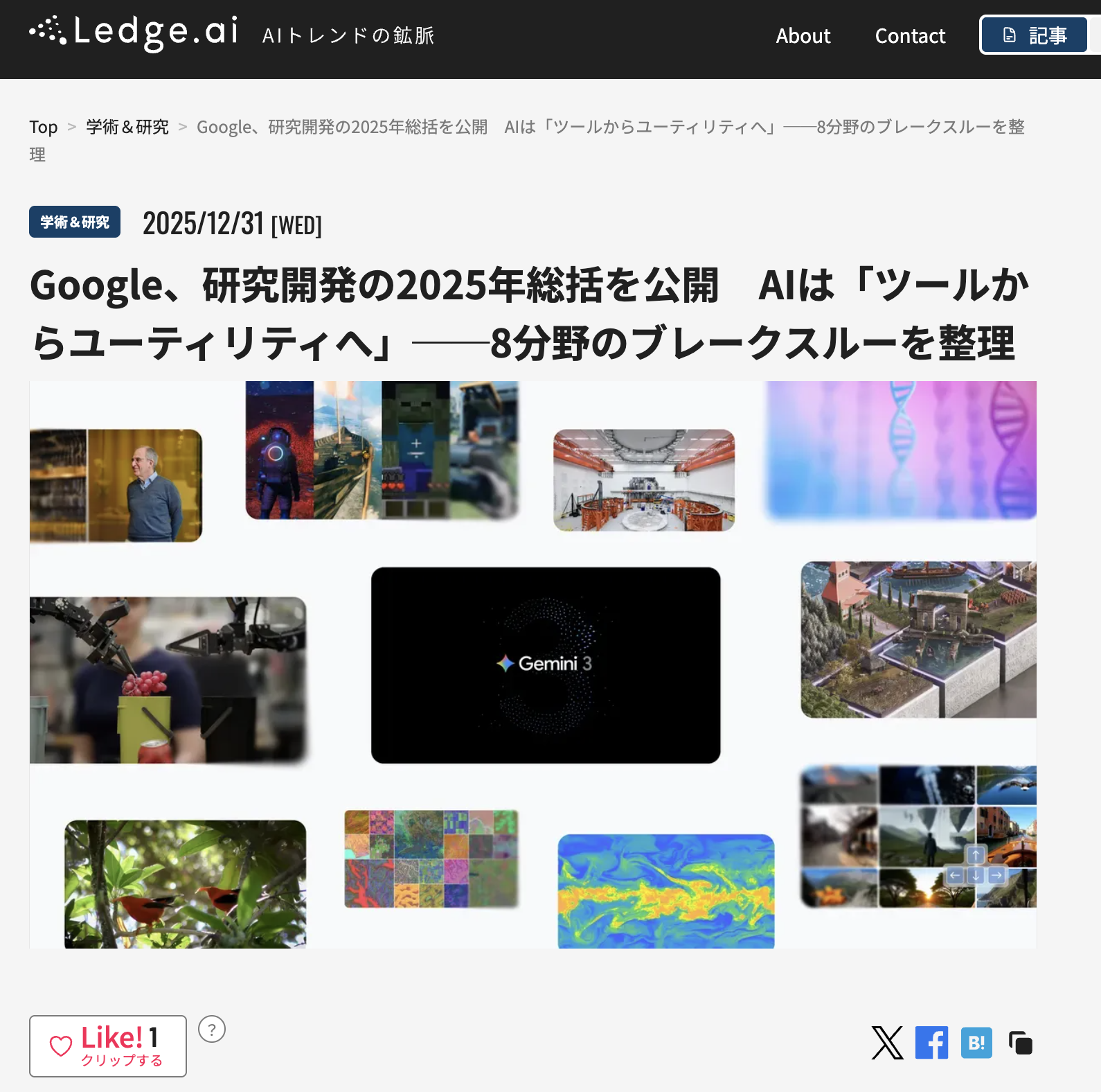 Ledge AI「Google、研究開発の2025年総括を公開 AIは「ツールからユーティリティへ」──8分野のブレークスルーを整理」