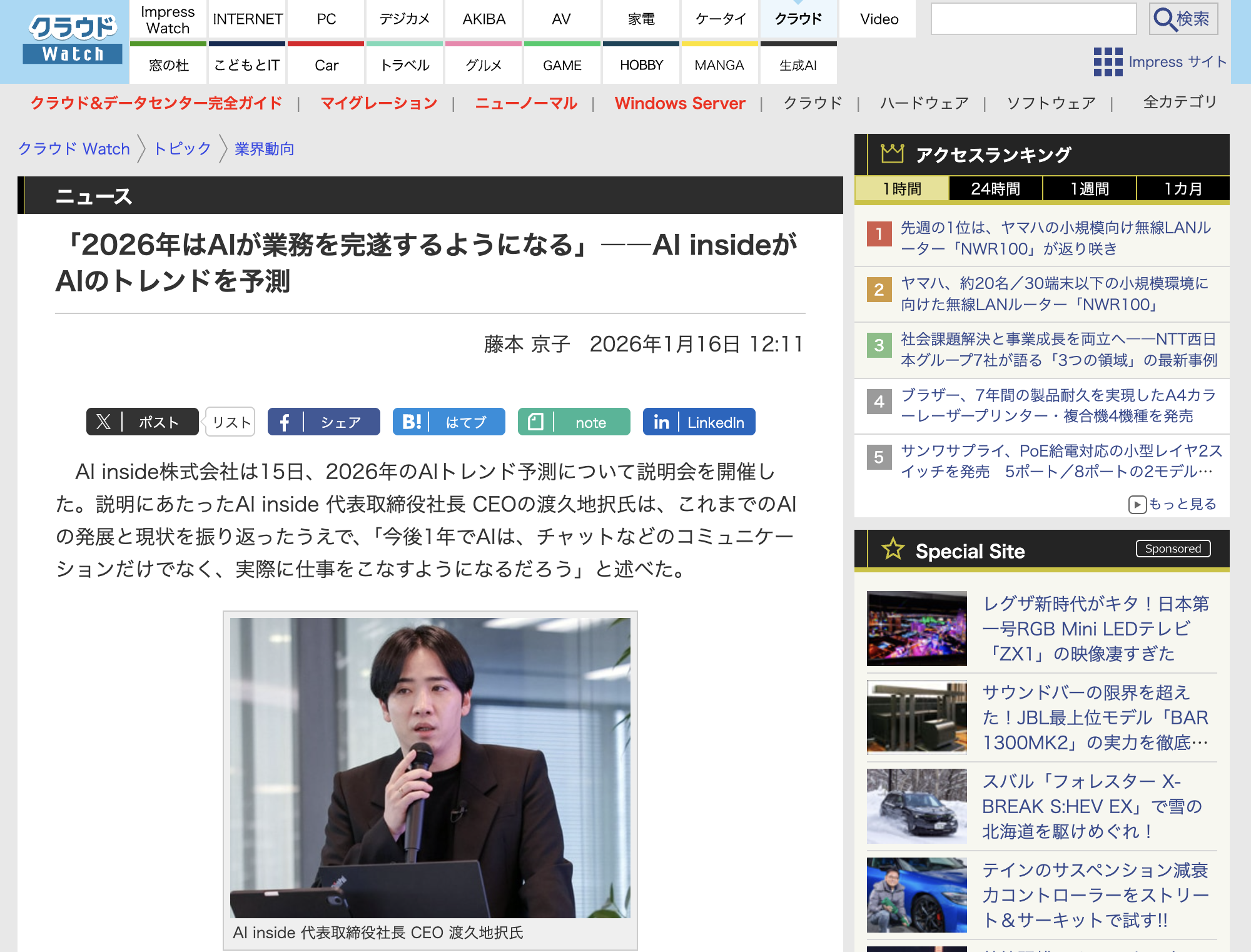 AI insideの代表取締役CEOである渡久地氏は、2026年を「業務完遂AI」の年になると予測しています。