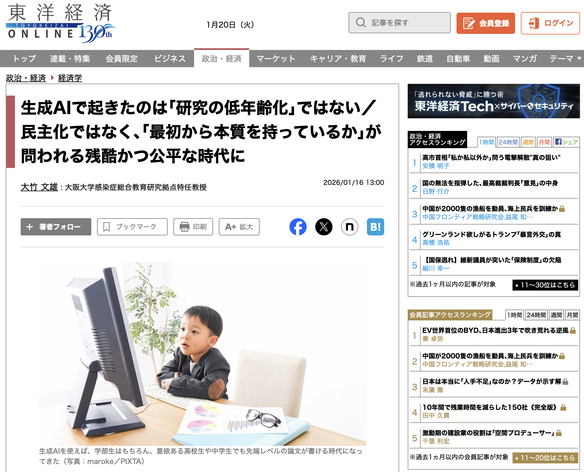 東洋経済オンライン「生成AIで起きたのは「研究の低年齢化」ではない/民主化ではなく、「最初から本質を持っているか」が問われる残酷かつ公平な時代に」
