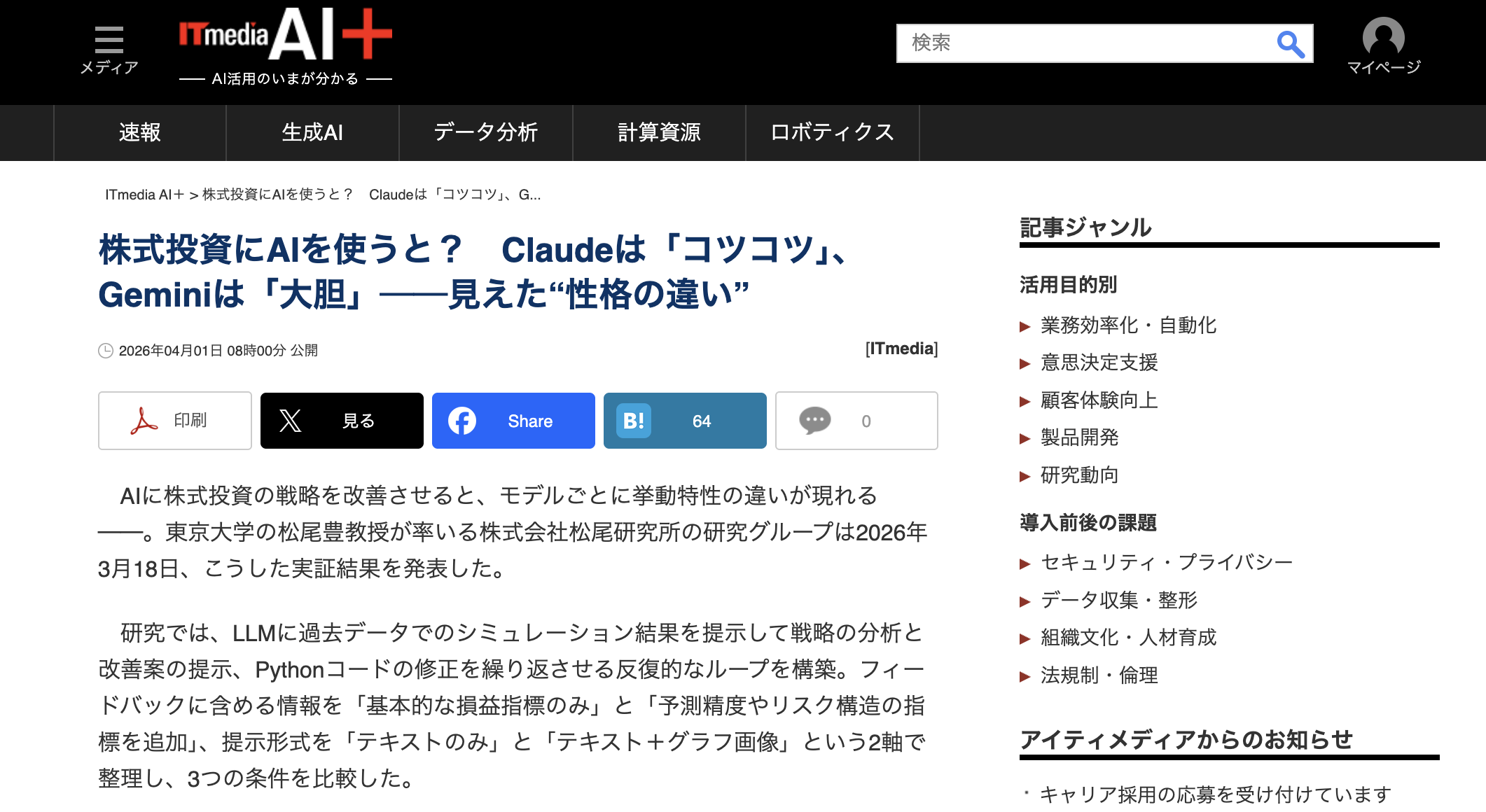 ITmediaAI+「株式投資にAIを使うと? Claudeは「コツコツ」、Geminiは「大胆」──見えた“性格の違い”」