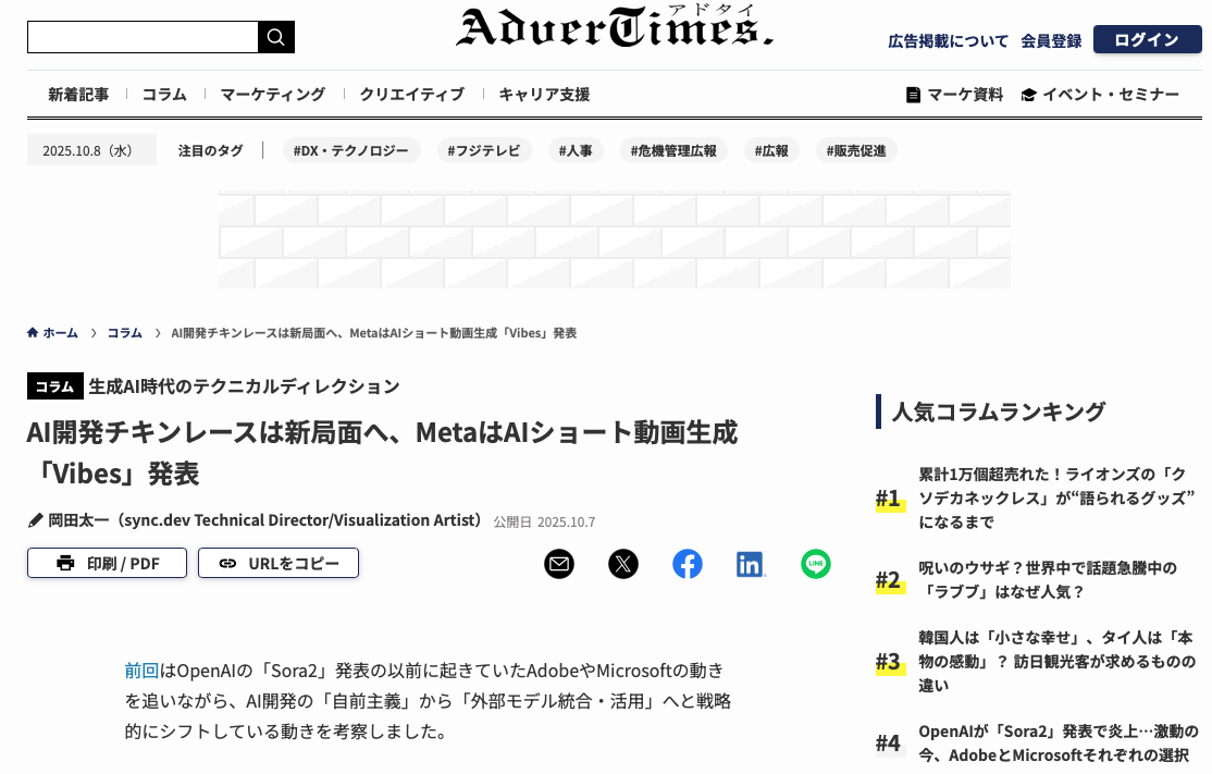 Advertimes「AI開発チキンレースは新局面へ、MetaはAIショート動画生成「Vibes」発表 - アドタイ(AdverTimes) by 宣伝会議」