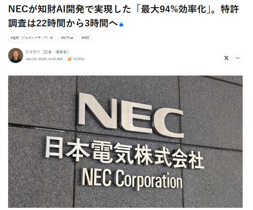 この記事では、NECがどのようにして生成AIを知財業務に浸透させ、効率化を達成したのか。その具体的な手法から、他社が陥りやすい「DXの罠」を回避するためのポイントまで、現場のリアルな視点を交えて徹底的に深掘りします。