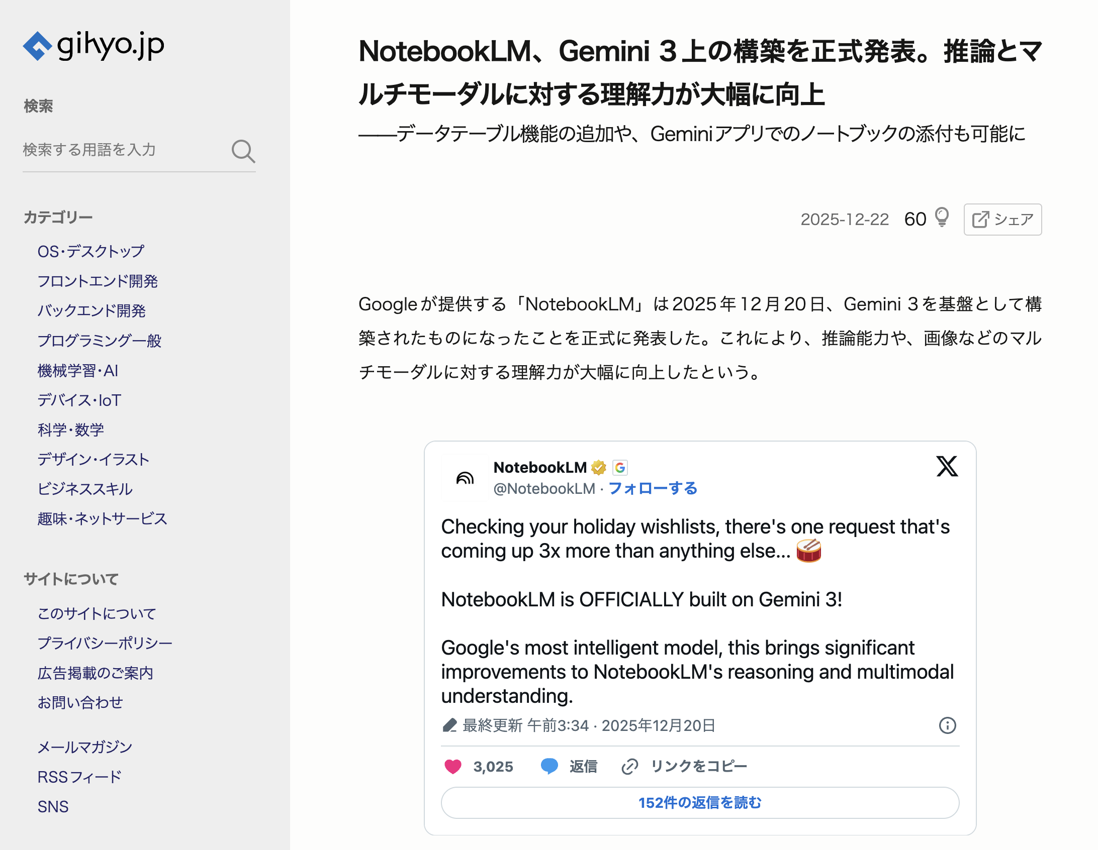 gihyo.jp「NotebookLM、Gemini 3上の構築を正式発表。推論とマルチモーダルに対する理解力が大幅に向上