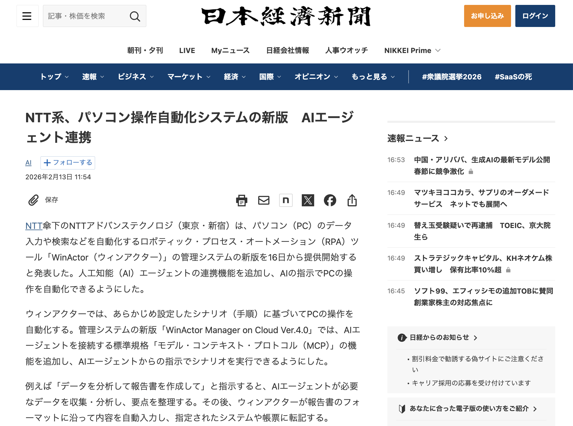 - WinActor新版はAIエージェント連携により「判断を伴う自動化」を実現。