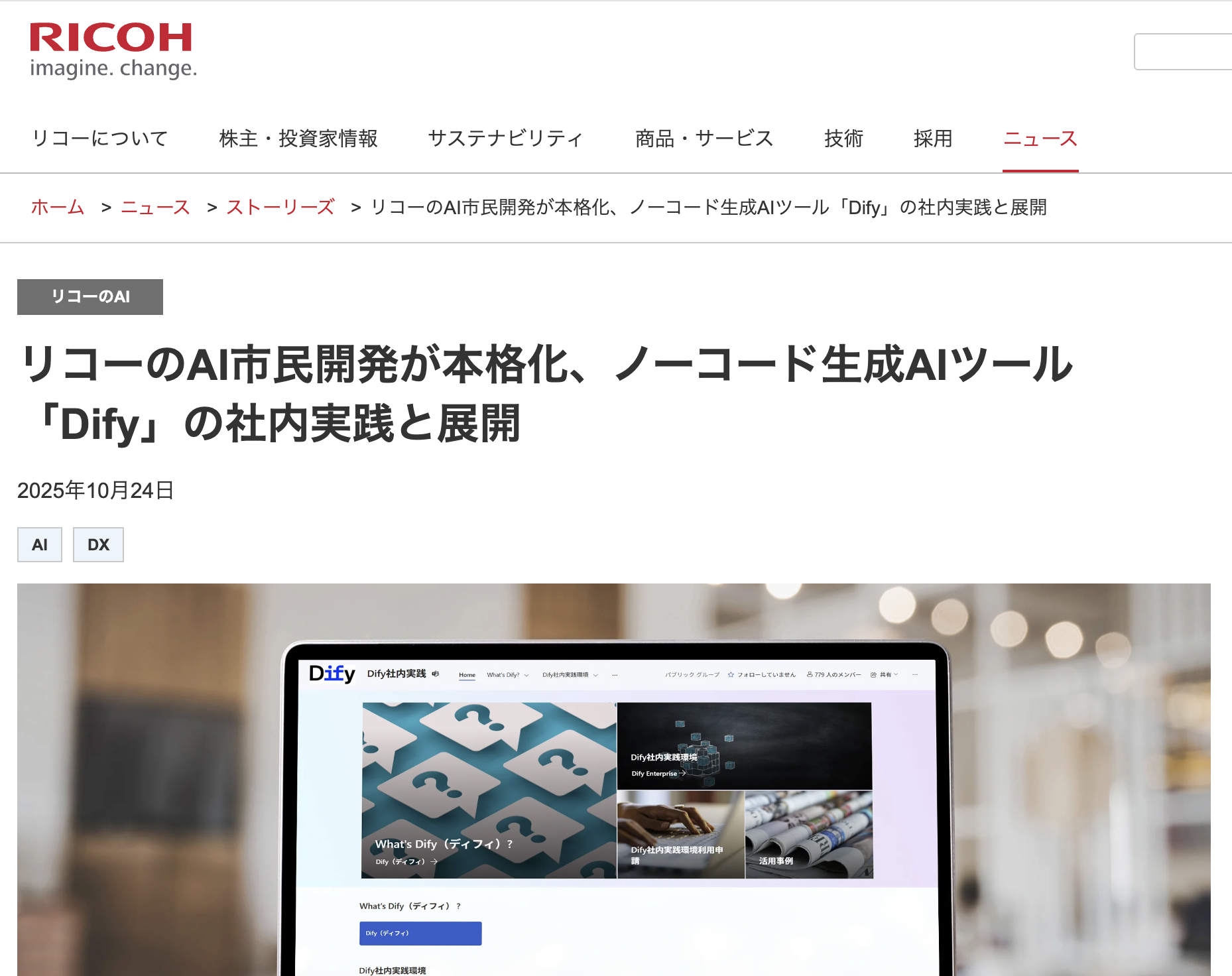 本記事では、リコーがなぜ「Dify」を選び、いかにしてこの「AI市民開発」という大きな波を全社に広げていったのか、その具体的なプロセスと活用の裏側、そして試行錯誤の軌跡を徹底的に解説します。自社でAI活用を進めたいすべての担当者にとって、実践的なヒントが詰まっています。