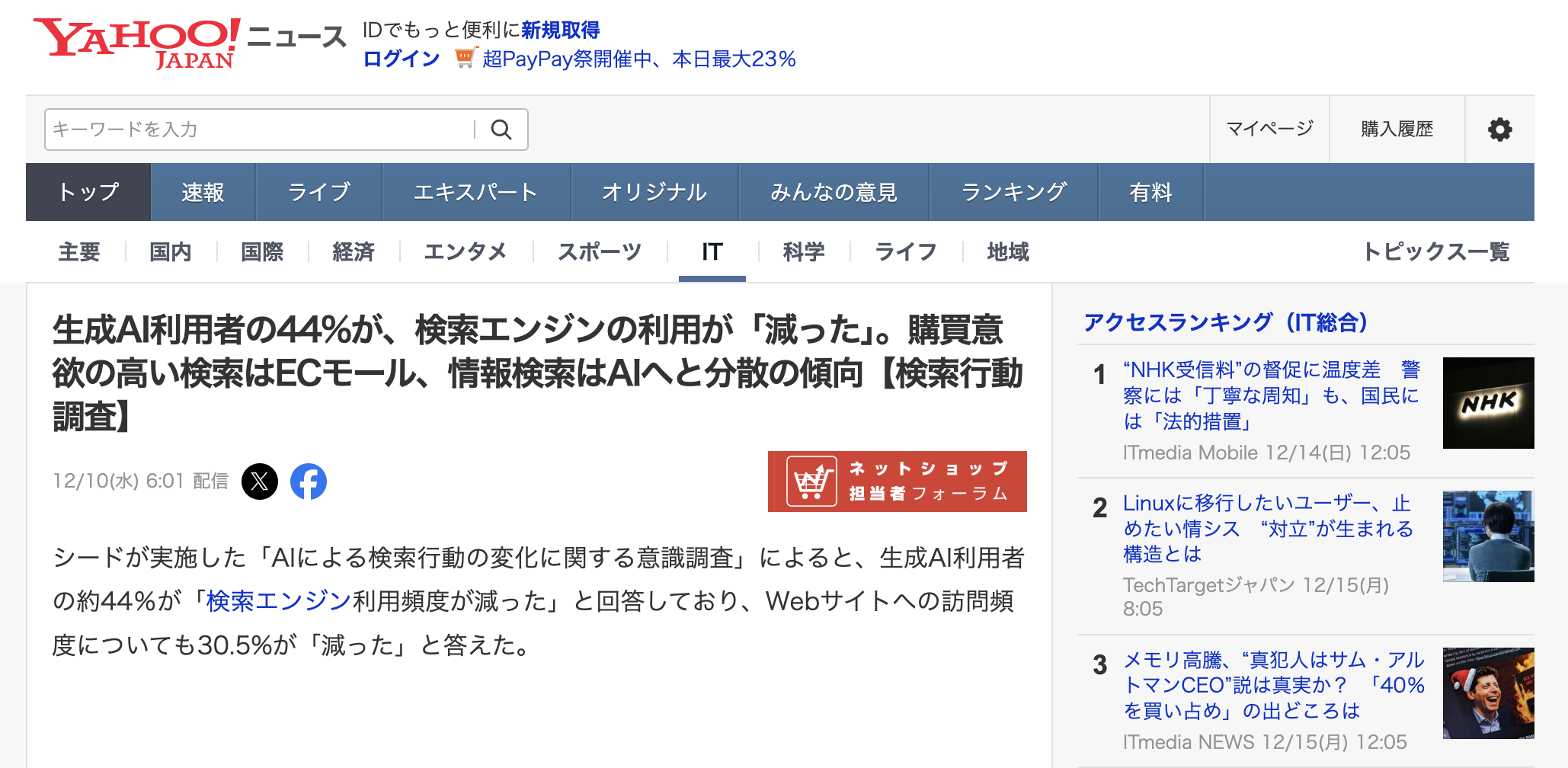 Yahoo! JAPANを運営するLINEヤフーなどの調査によると、生成AIを利用しているユーザーの44%が「検索エンジンの利用頻度が減った」と回答しました。さらに興味深いのは、その移行先です。