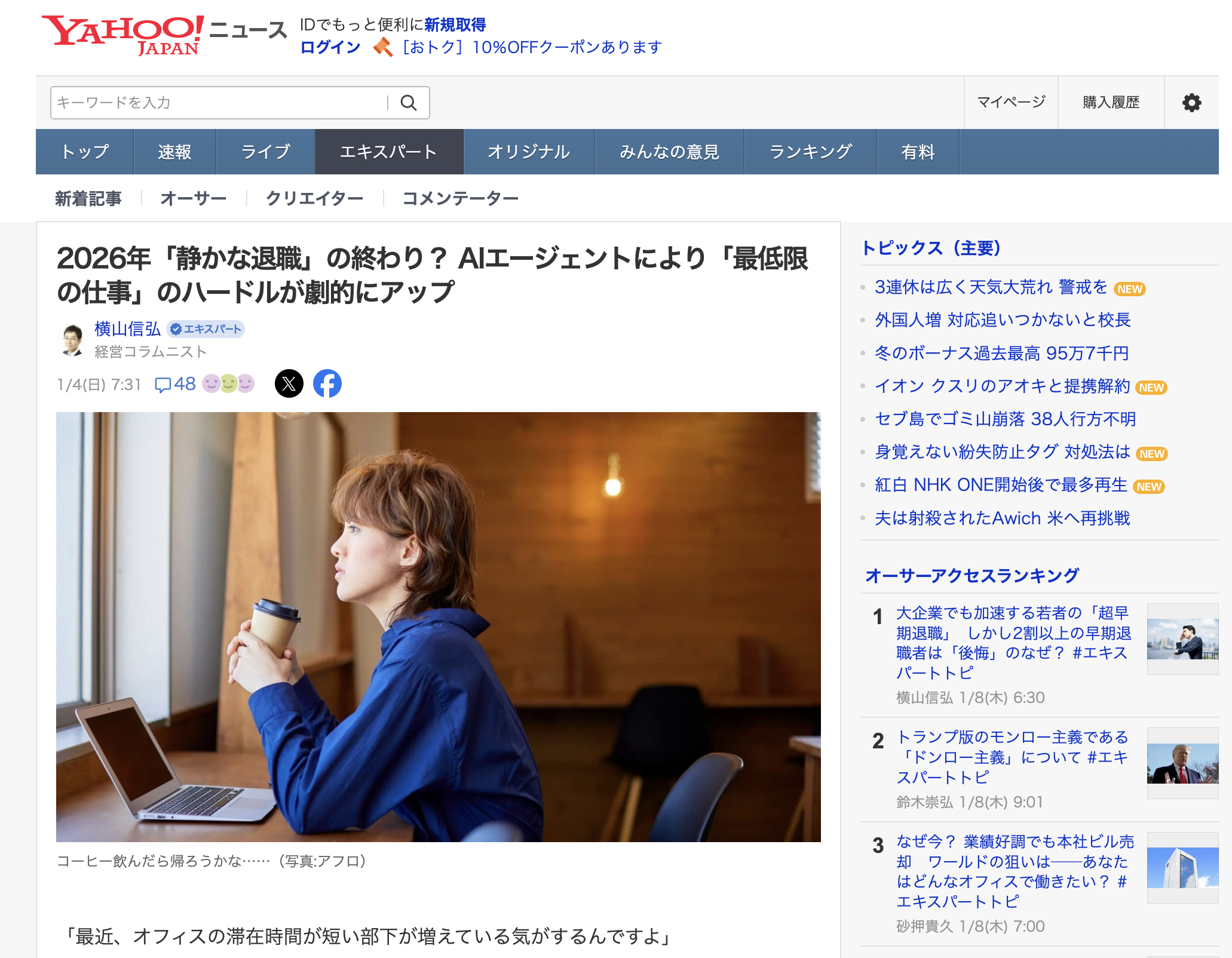 Yahoo!ニュース「2026年「静かな退職」の終わり? AIエージェントにより「最低限の仕事」のハードルが劇的にアップ」